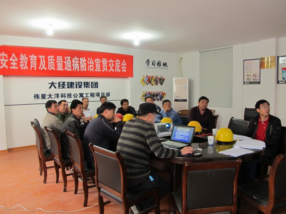 根據(jù)省、市各相關文件要求,2011年5月24日至26日工程部組織對臨海在建工程各項目部相關人員進行了現(xiàn)場安全教育及質量通病防治宣貫交底。重點宣貫了臺建規(guī)〔2011〕136號《關于加強建筑企業(yè)和施工現(xiàn)場安全生產基礎工作的若干規(guī)定》、臺建規(guī)[2011]151號《臺州市住宅工程質量通病防治活動方案》和臺建規(guī)[2011]202號《臺州市住宅工程質量通病防治導則》等。要求各項目部以“安全責任、重在落實”為主題,積極開展“安全生產月”活動,并建立健全建筑施工現(xiàn)場安全生產保障體系,進一步嚴格安全生產管理,扎實落實施工現(xiàn)場安全生產28條基本規(guī)定,建立堅實的施工現(xiàn)場安全生產保障體系。要求以“保障民生,建設群眾滿意住宅”為主題明確施工單位的責任和義務,認真研讀設計文件,配備相關圖集。施工組織設計編制應明確通病防治的目標和工作措施,編制通病防治專項施工方案,施工過程中嚴格按已經批準的方案實施,并根據(jù)工程進度做好相應部位通病防治的技術交底工作。做好原材料、構配件的報驗工作。建立、健全施工質量的檢驗制度,嚴格工序管理,作好隱蔽工程的質量檢查和記錄。按要求完成通病防治相關的各類功能性檢驗項目,做好通病防治的技術資料的收集、整理工作。要求各項目部根據(jù)墻體裂縫防治技術措施、鋼筋混凝土現(xiàn)澆板裂縫防治技術措施、外墻滲漏防治技術措施、樓地面滲漏防治技術措施、門窗滲漏防治技術措施、屋面滲漏防治技術措施,項目部要通過開展技術培訓、講座、交底等活動,對管理人員、技術人員和一線工人進行培訓,做到人人明確職責、事事不忘通病、條條得到落實。